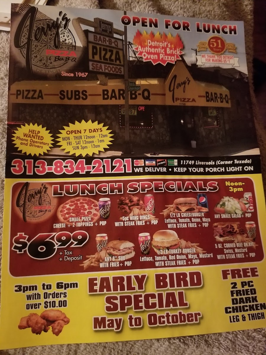 Welcome to Jerry's Pizza and Barbecue, a beloved gem located at 11749 Livernois in Detroit, MI. Known for its generous portions and fresh ingredients, Jerry's specializes in crowd-pleasing pizzas that never skimp on flavor or toppings. Whether you're craving a supreme pizza or mouthwatering triple cheesy breadsticks, each dish is crafted with care, ensuring the crust remains perfectly intact. Their diverse offering extends beyond pizza to include enticing options like Pasta & Perch Fish Dinner and an array of delectable desserts, such as Strawberry Cheesecake and Peach Cobbler.